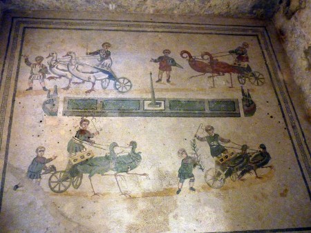 (Sidenote: Setting aside my incredulity over these seemingly small birds pulling chariots, there are a few aspects of the children’s race mosaic that give it credibility. Firstly, the racing team colors – red, white, blue, and green – match what we know of Roman racing. Secondly, you can see the reins wrapped around the team drivers’ waists. This was apparently how Roman racers steered their chariots as opposed to holding them in their hand like Greeks did.)
