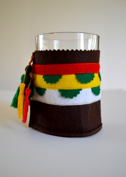 I did cheat and invented one feature: the multicolored, tasseled felt glass cozy is completely unsupported by the text. I chose it to add a little more color to the setting and to hide the undeniably modern glass underneath.