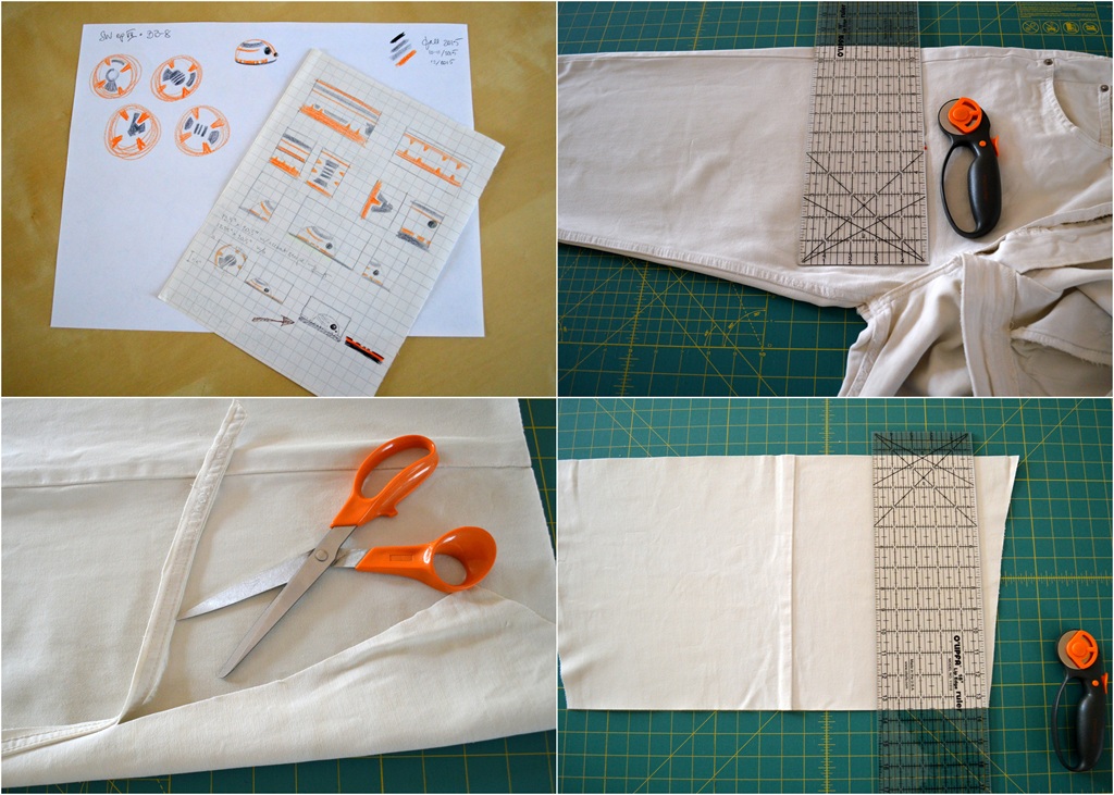 1 of 4: Deciding on the droid design and cutting as large piece as possible from one pant leg.
