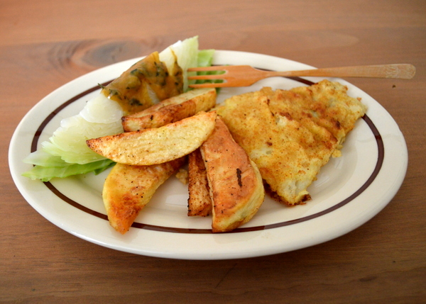 This is a simple recipe that shallow-fries the fish instead of deep-frying. The potatoes are actually roasted, not fried, but they have an excellent texture.