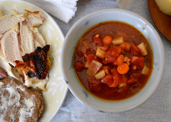 There are plenty of different kinds of soup I could have picked for this dinner, but I went with a vegetable soup since there are no other vegetables on the table. It makes a good complement to the cold meats. This soup uses beer in the broth and works well as a way of using up old, flat beer, a problem that even as busy a tavern as the Prancing Pony would have to solve.