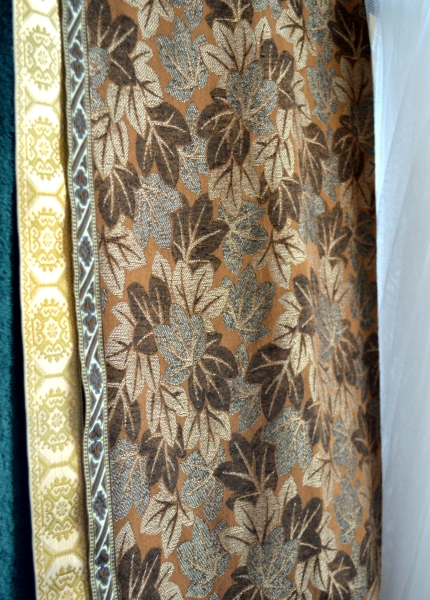 I also wanted to have something in the background to suggest ornate wall hangings. We don’t own anything of the sort, so instead I chose a piece of cloth with a woven leaf pattern in shades of brown with a lot of metallic thread. Then I hung coordinating ribbons—including one in gold—at its edge for additional shimmer.