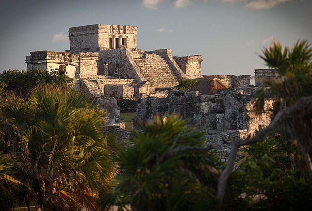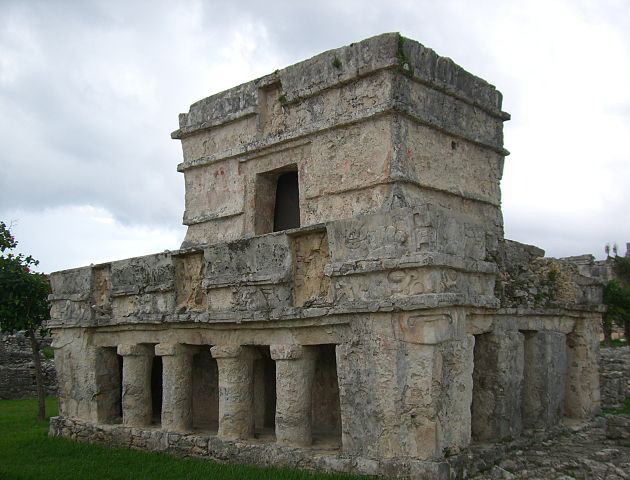 Images: “El Castillo,” photograph by Greg Willis via Wikimedia. Temple of the wind god, photograph by Popo le Chien via Wikimedia. Aerial view of Tulum, photograph by Dronepicr via Wikimedia. Temple of the Frescoes, photograph by Diego Delso, delso.photo, License CC-BY-SA via Wikimedia.