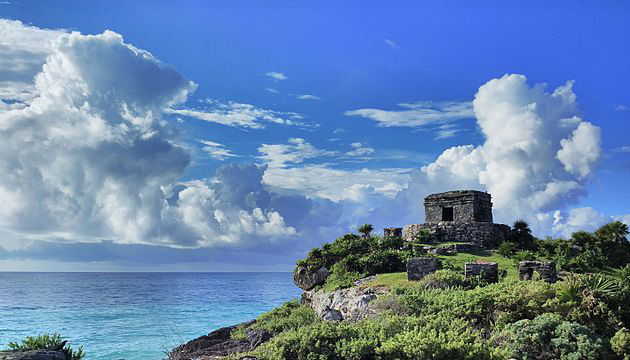 The city of Tulum is one of the best-preserved ancient Maya cities on the coast of Central America. It served as the principal seaport for nearby inland cities on the Yucatán Peninsula, connecting overland trade routes with seaborne trade in the Carbibbean. The walled city sits right on a cliff overlooking the sea from which beacons may have served as a lighthouse to help guide incoming ships through a gap in the barrier reef. A small sheltered beach between cliffs provided a safe landing. Imagine piloting a trade canoe laden with salt and textiles through a stormy night, trying to keep the beacon fire in sight as the waves crash on the reef all around.