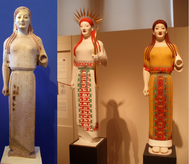 Evidence like this makes it possible to attempt to reconstruct what statues of this type looked like when first created. The two reconstructions on the right here offer two possible interpretations of what the original, on the left, may have looked like when it was new.