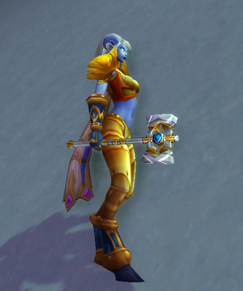 For my death knight, I’ve shunned the dark, spiky, skull-heavy style that Blizzard seems to love and put her in glorious golden armor with touches of blue and purple. The artifact axe that blood death knights get does not suit the look at all, so I’ve transmogged over the axe with a gleaming silver and blue mace that feels much better for her.