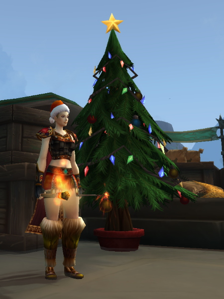 Fortunately it was possible to mog her weapon into a torch and offhand into a sparkler. Both are at least a little more festive than weaponry. 🙂 If interested, you can have a look at the set in Wowhead’s Dressing Room.