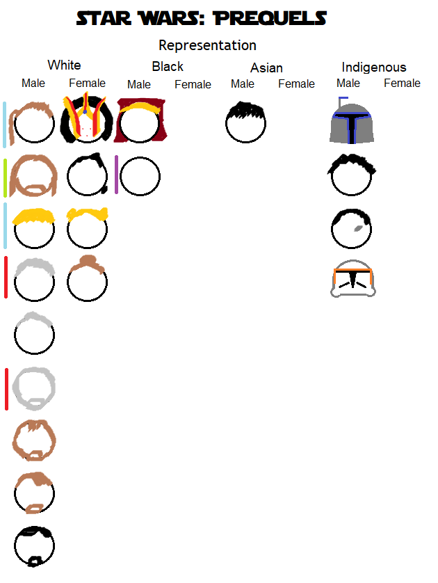 We all know that the representation of people of different genders and races is imbalanced in popular media, but sometimes putting it into visual form can help make the imbalance clear. Here’s a chart of the Star Wars prequel movies (Episode I: The Phantom Menace, Episode II: Attack of the Clones, Episode III: The Revenge of the Sith).