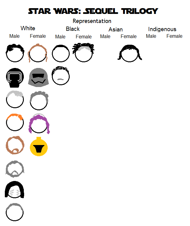 We all know that the representation of people of different genders and races is imbalanced in popular media, but sometimes putting it into visual form can help make the imbalance clear. Here’s a chart of the Star Wars sequel trilogy movies (Episode VII: The Force Awakens, Episode VIII: The Last Jedi, Episode IX: The Rise of Skywalker).