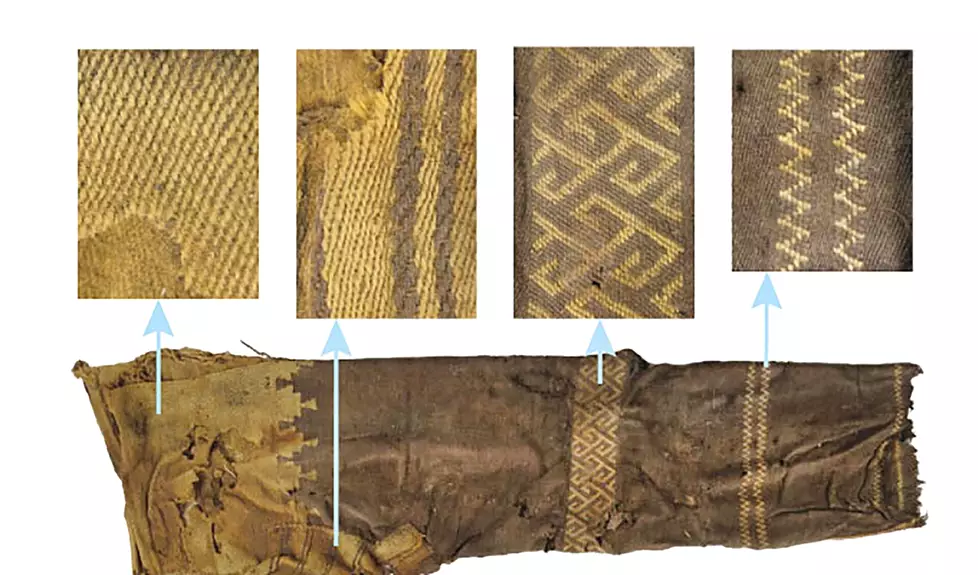 All three pieces included some woven patterning. Besides striping, the leg pieces also had a decorative band in a T-hook pattern (a kind of geometric design) around the knees.