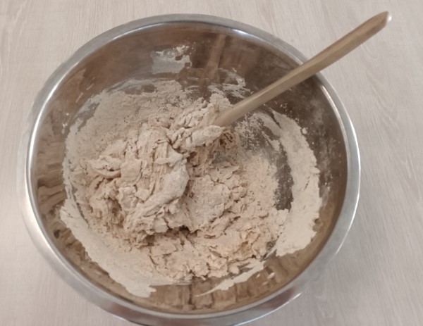 Add the yeast/sugar water to the flour bowl and mix well. The dough will be dry and shaggy, and may not incorporate all the flour.