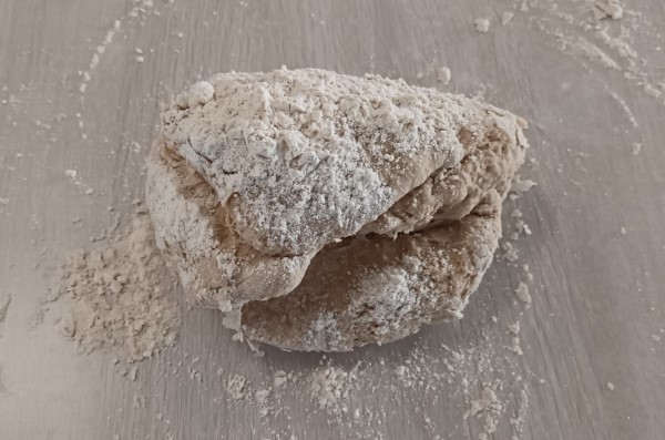 After ten minutes, turn the dough out on a counter. The dough should still be stiff and dry, so you should not need to flour your counter for this step.