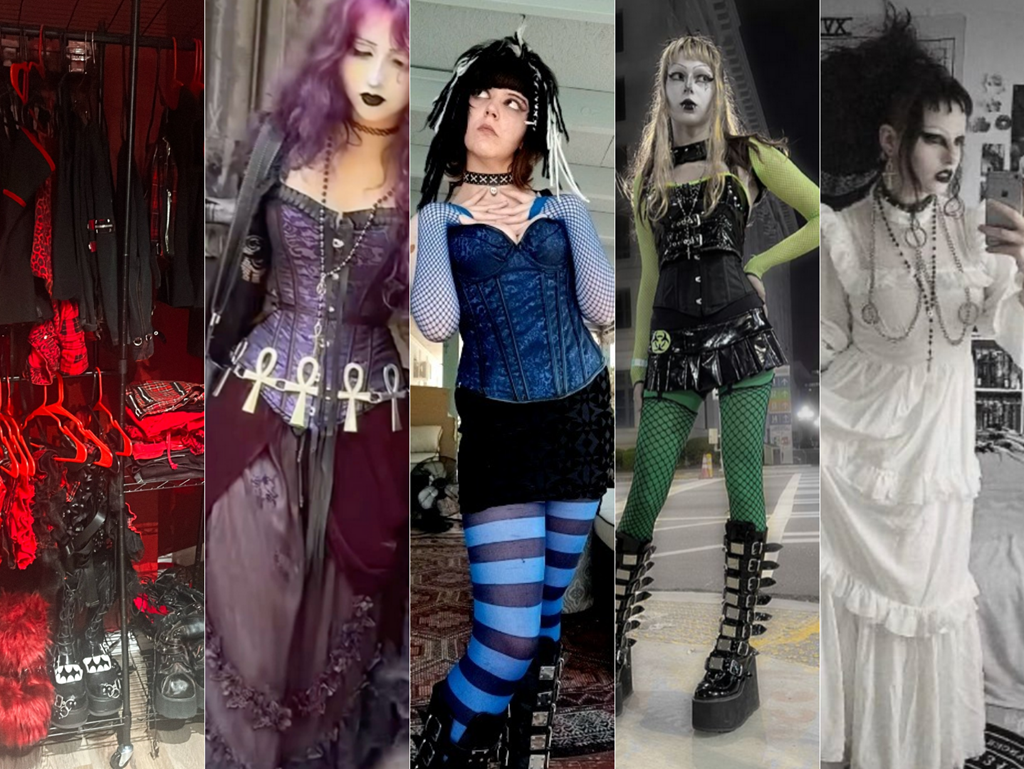 Images: Mashup by Eppu Jensen: red and black outfits by hystericb0y on Tumblr; purple goth by sabikuma on tiktok, found via peri on Pinterest; blue goth by dogmaz on Tumblr; green goth via Yasmin on Pinterest; white goth via Mabel Manley on Pinterest. Yellow Y2K goth outfit (bee goth) by EJ on Pinterest.