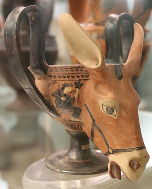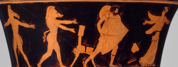 Image: Circe flees from Odysseus, with animal-headed crew, detail of photograph via Wikimedia (Metropolitan Museum of Art; c. 440 BCE; red-figure vase; by the Persephone Painter)