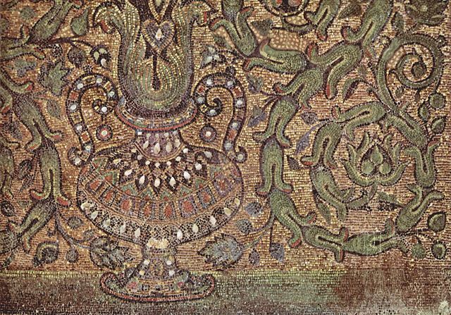 Interior mosaic, photograph by the Yorck Project via Wikimedia (Jerusalem; originally 692, later restored; glass, mother of pearl, and stone mosaic)