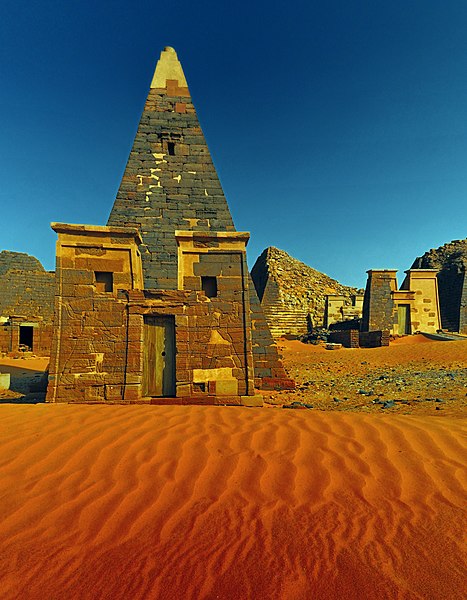 The custom of building tombs in this style took hold in Nubia. Despite the depredations of modern treasure hunters, there are, in fact, about twice as many Nubian pyramids still standing today as Egyptian. They are are a remarkable piece of world heritage and a fascinating example of the adaptation and reinvention of one culture’s ideas in the hands of another.