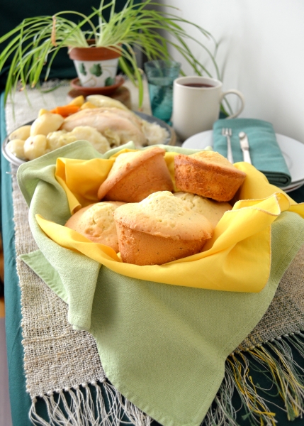 The table setting is sunny and cheerful, decorated with the Hobbits’ favorite colors. An unbleached linen table runner with green and yellow stripes sits over a dark green tablecloth. Green also comes on the napkins and plant pot with an ivy motif. The dinner is served on one large, hefty platter. A cloth-lined bread basket holds the small dessert seed-cakes. Fancy water glasses add another pop of greenish hues to the table.