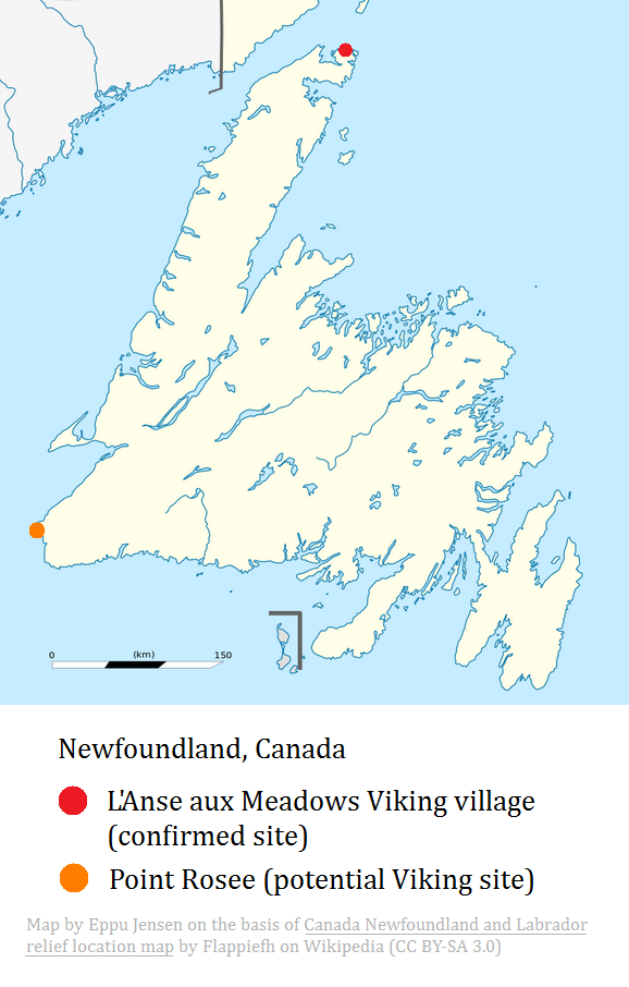 CBC News reports that evidence of a Norse-like hearth and 8 kilograms (approx. 16 pounds) of bog iron was found at Point Rosee during a dig in 2015. It isn’t yet known for sure whether the site was a temporary base camp or a settlement, or whether it even was associated with Vikings. If confirmed, Point Rosee would be the second known Viking site in North America.