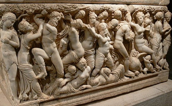 Image: A scene of Bacchic revelry from a Roman sarcophagus, photograph by Wolfgang Sauber via Wikimedia (currently Anatalya Archaeological Museum; 2nd c. CE; marble)